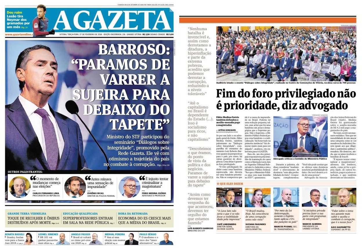 Em sua edição de 27/2, o diário capixaba trouxe um resumo da conferência de Fábio Medina Osório, além de destacar a participação do ministro Luís Roberto Barroso, do STF, que ministrou a palestra de abertura do evento.